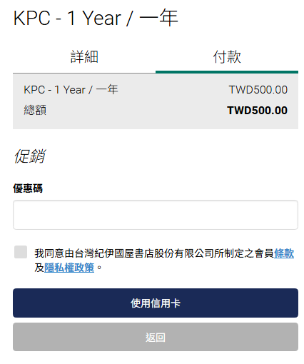填寫信用卡相關資料及信用卡號並完成付款後,即可在「我的行動K書卡」頁面確認會員卡QR code並立即享有會員優惠。